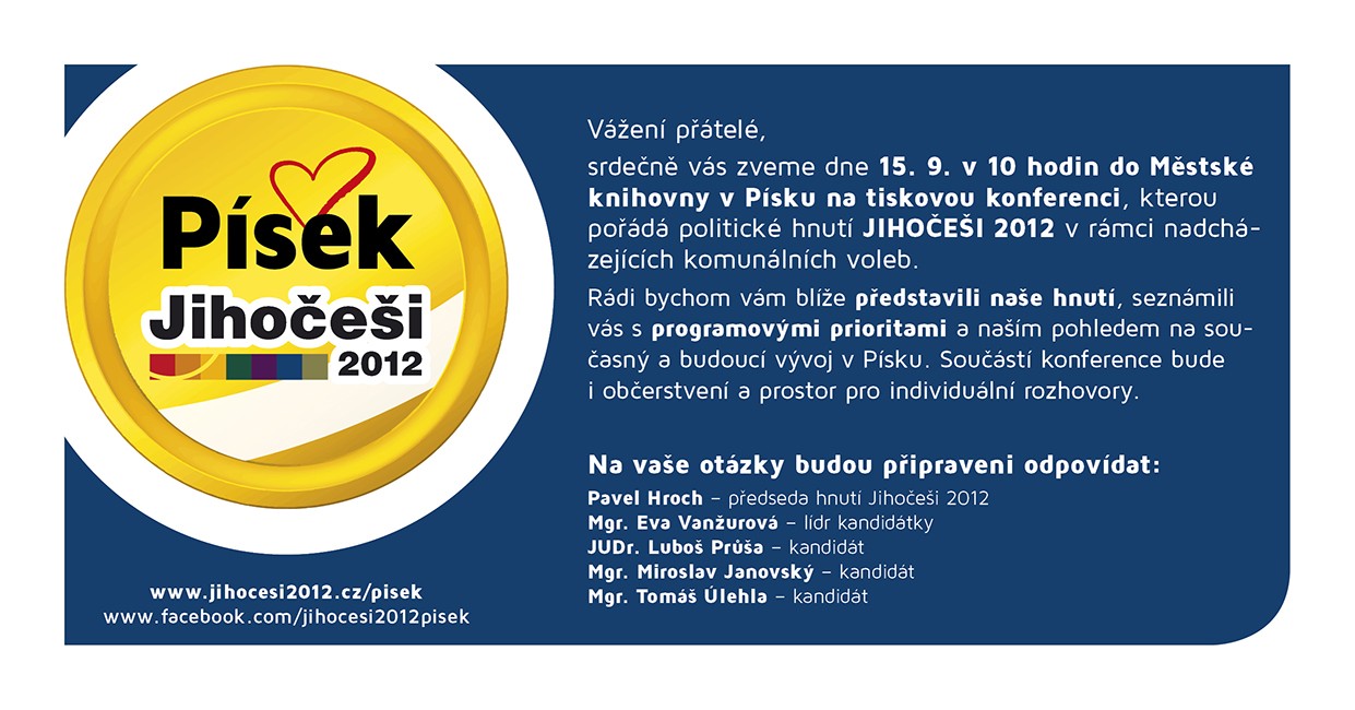 Dne 15. září 2014 v 10.00 hodin se v Městské knihovně v Písku koná tisková konference hnutí Jihočeši 2012 ke komunálním volbám v Písku.